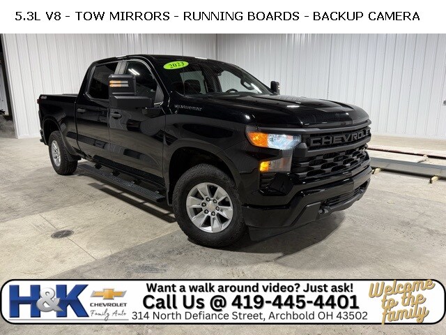 H&K Chevrolet of Archbold has been family owned and operated for over 70 years. Quietly located in NW Ohio, in a town of 4000 people. Customer service and honesty, are top priorities at Christy. We price our vehicles honestly, and straight forward to give you the easiest buying experience possible. New Price! Black 2023 Chevrolet Silverado 1500 WT 4WD 10-Speed Automatic