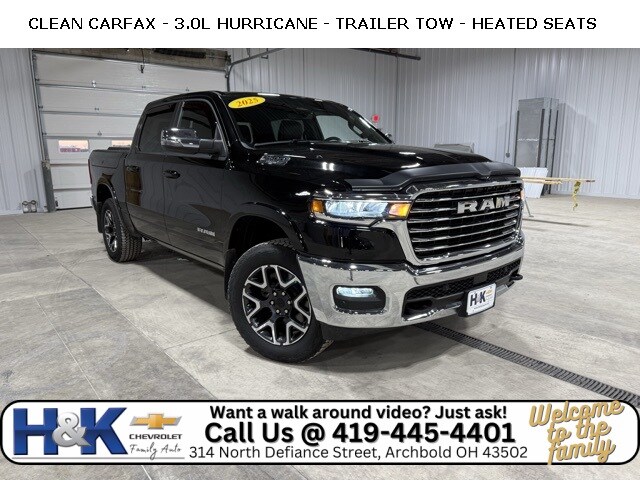 H&K Chevrolet of Archbold has been family owned and operated for over 70 years. Quietly located in NW Ohio, in a town of 4000 people. Customer service and honesty, are top priorities at Christy. We price our vehicles honestly, and straight forward to give you the easiest buying experience possible. Diamond Black Crystal Pearlcoat 2025 Ram 1500 Laramie 4WD 8-Speed Automatic